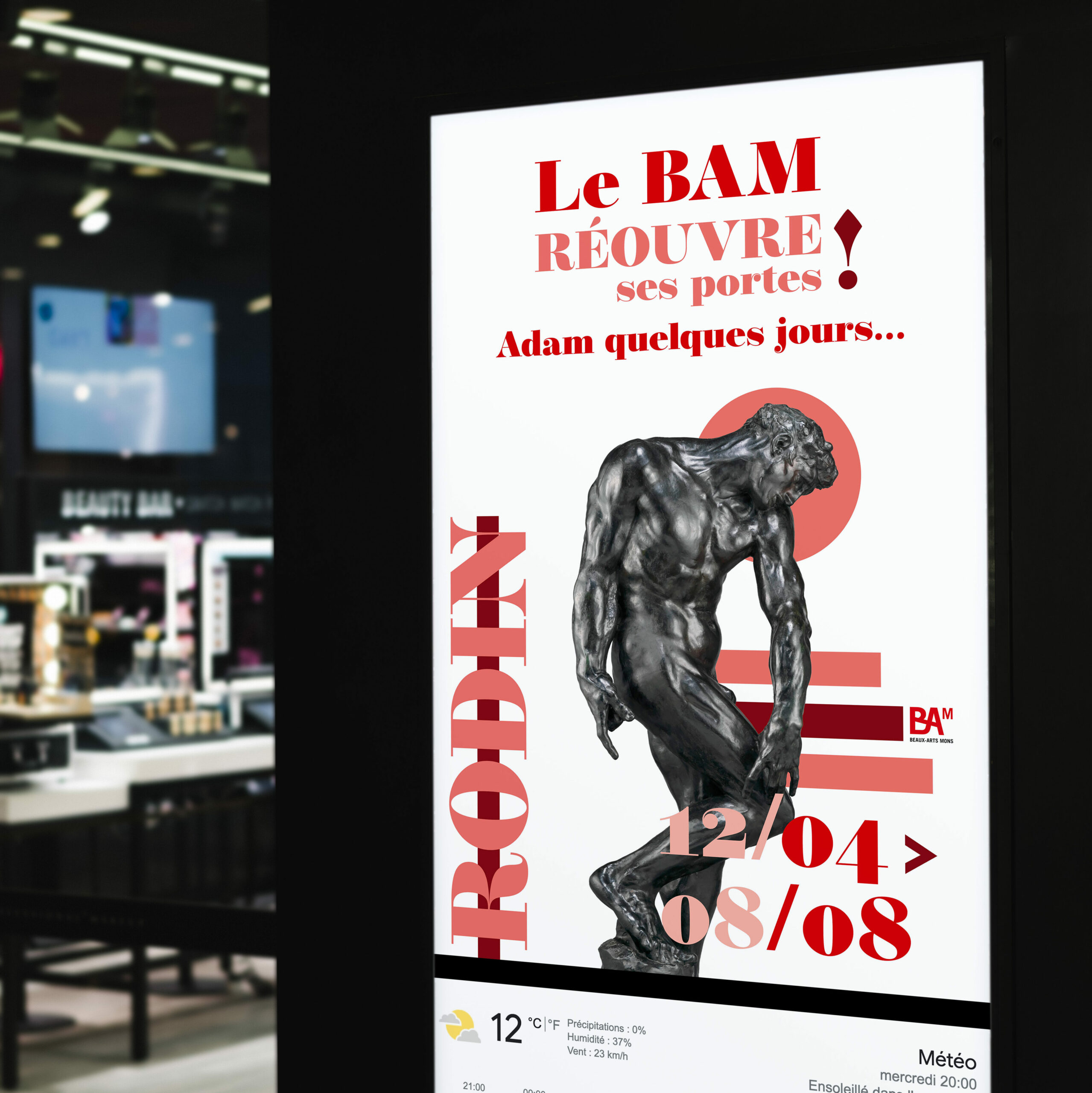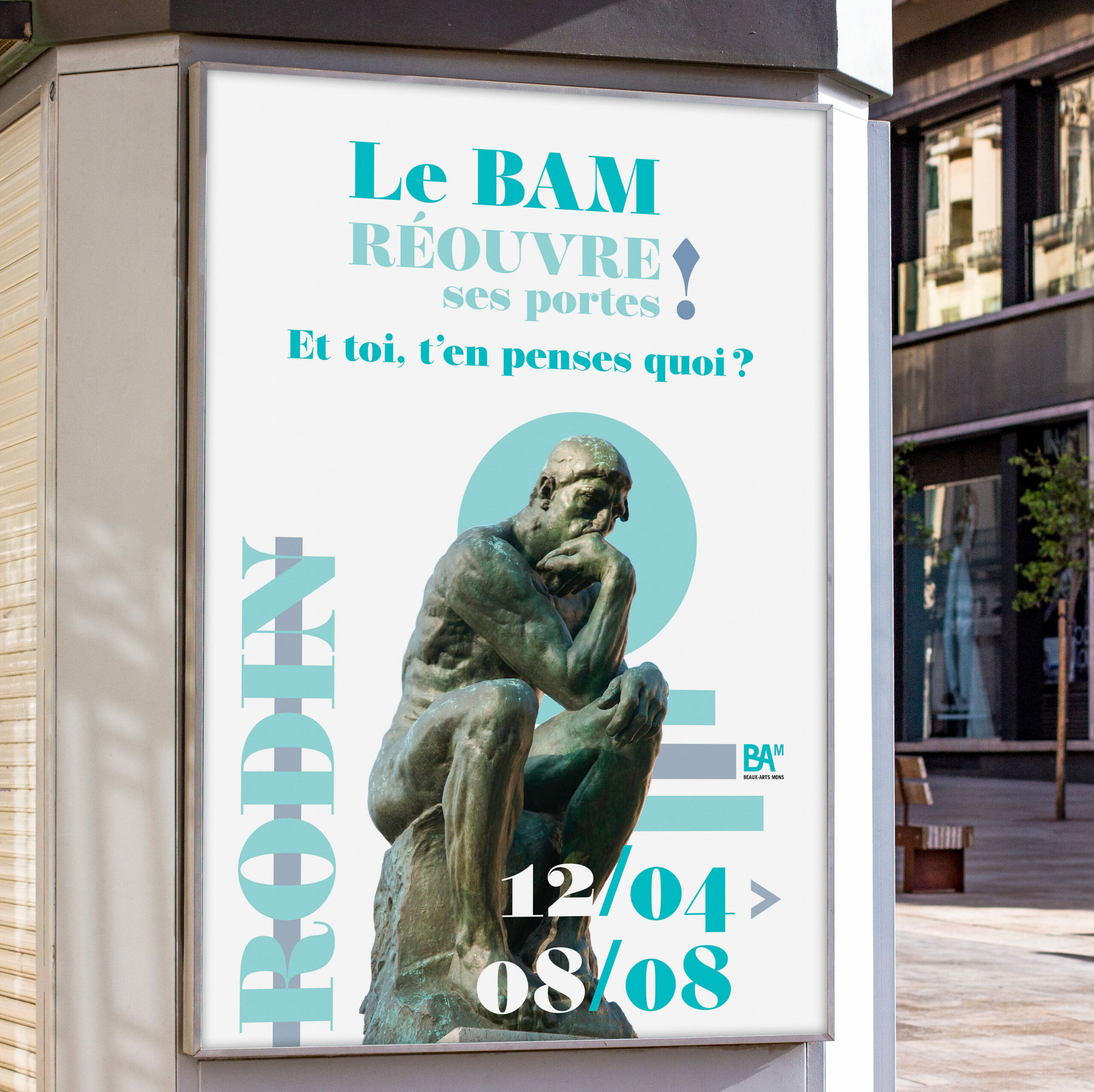 J’ai eu l’idée de d’abord jouer avec les mots sur le fait que le BAM réouvre ses portes. Les affiches doivent être en préférence placée derrière des portes (centre commerciaux, office du tourisme…) pour que le Headline soit très accrocheur.