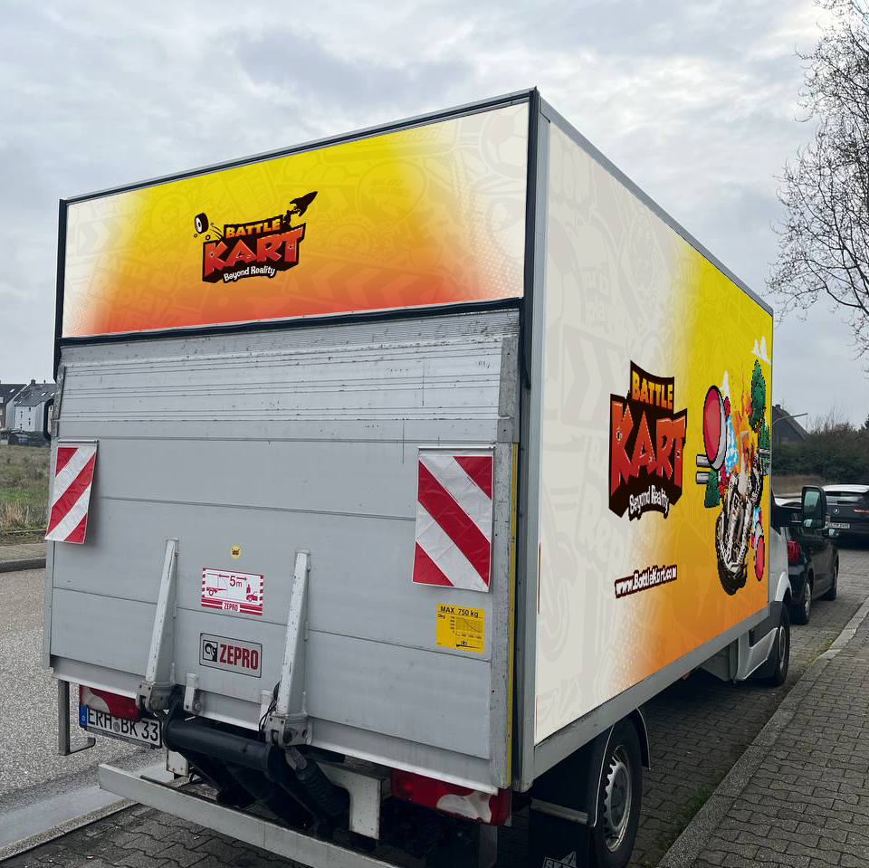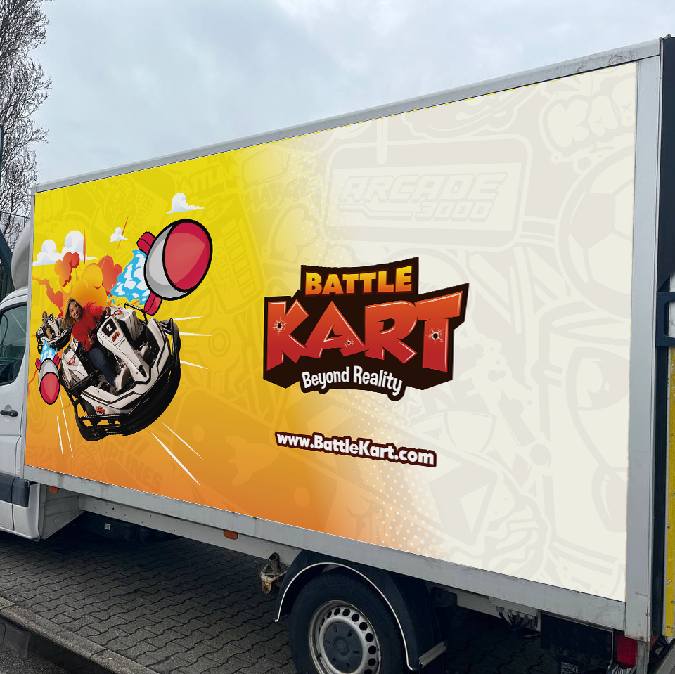 Création de divers covering de véhicules et de stickering de façade à l’image de marque de BattleKart. Respecter l’image de marque et les contraintes des différents supports.